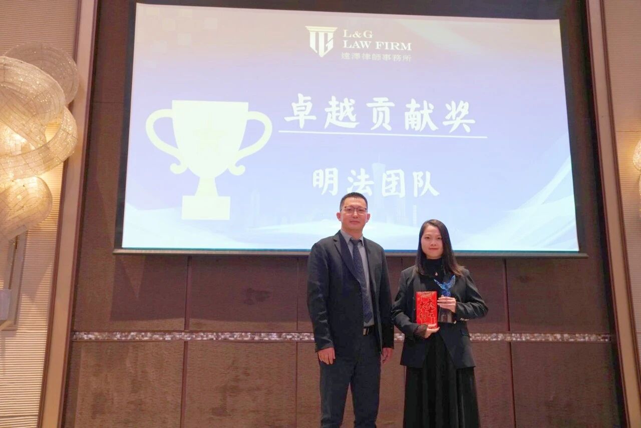 明法团队摘得 “卓越贡献奖”。刘松律师上台,为团队代表李素文律师颁发这份荣誉。