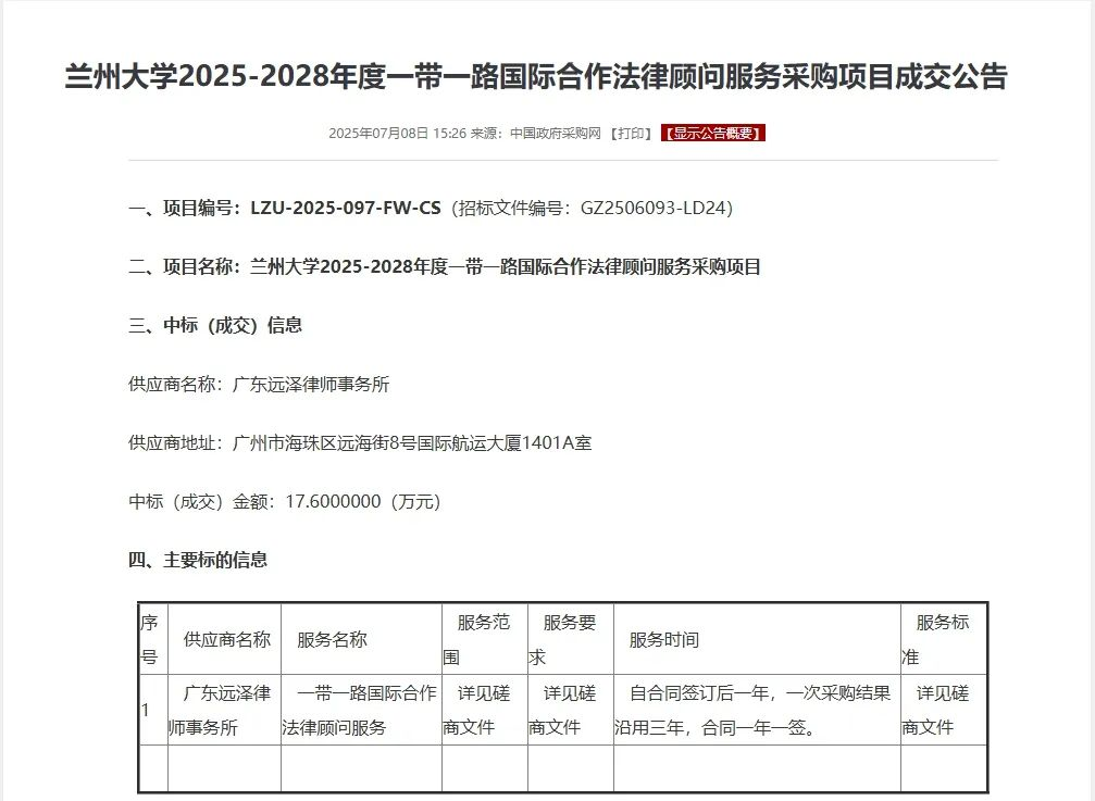 2025年7月8日,兰州大学采购管理办公室发布“兰州大学2025-2028年度一带一路国际合作法律服务采购项目”的成交结果。广东远泽律师事务所为展示律所具有高水平的涉外与国际法律服务能力,组建了以王望伟律师、刘松律师为主的法律服务团队参与磋商并成为最终的成交供应商。